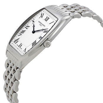 Stainless steel case with a stainless steel bracelet. Fixed stainless steel bezel. Silver dial with Roman numeral hour markers. Minute markers around the outer rim. Dial Type: Analog. Date display at the 3 o'clock position. Frederique Constant Calibre FC-220 quartz movement. Scratch resistant sapphire crystal. Pull / push crown. Solid case back. Case size: 47 mm x 36 mm. Case thickness: 11.2 mm. Tonneau case shape. Deployment clasp. Water resistant at 30 meters / 100 feet. Functions: date, hour, minute. Luxury watch style. Watch label: Swiss Made. Frederique Constant Art Deco Silver Dial Men's Watch FC-220MC4T26B.