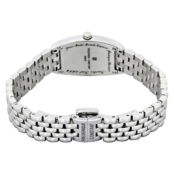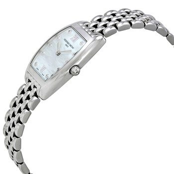 Stainless steel case with a stainless steel bracelet. Fixed stainless steel bezel. White mother of pearl dial with silver-tone hands and diamond hour markers. Dial Type: Analog. Quartz movement. Scratch resistant sapphire crystal. Pull / push crown. Solid case back. Case size: 30.50 mm x 21 mm. Case thickness: 6 mm. Tonneau case shape. Band width: 12 mm. Band length: 6.5 inches. Deployment with push button release clasp. Water resistant at 30 meters / 100 feet. Functions: hour, minute. Dress watch style. Watch label: Swiss Made. Item Variations: FC 200MPWD1T26B, FC.200MPWD1T26B, FC200MPWD1T26B. Frederique Constant Art Deco White Dial Ladies Watch FC-200MPWD1T26B.