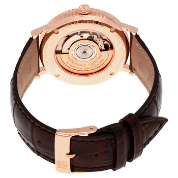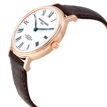 Rose gold-plated stainless steel case with a brown (crocodile) leather strap. Fixed rose gold-plated bezel. White porcelain enamel dial with blue hands and Roman numeral hour markers. Minute markers around the outer rim. Dial Type: Analog. Frederique Constant calibre FC302 automatic movement with a 38-hour power reserve. Scratch resistant sapphire crystal. Transparent case back. Case size: 39 mm. Case thickness: 8 mm. Round case shape. Band width: 20 mm. Band length: 7.85 inches. Tang clasp. Water resistant at 30 meters / 100 feet. Functions: hour, minute. Luxury watch style. Frederique Constant Art of Porcelain Automatic Men's Watch FC-302P4S4.