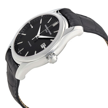 Stainless steel case with a black leather strap. Fixed stainless steel bezel. Black dial with luminous silver-tone dauphine-style shape hands and index hour markers. Minute markers around the outer rim. Dial Type: Analog. Luminescent hands. Date display at the 3 o'clock position. Frederique Constant calibre FC-303 Automatic movement, based upon Sellita SW200-1, containing 26 Jewels, bitting at 28800 vph, and has a power reserve of approximately 38 hours. Scratch resistant sapphire crystal. Screw down crown. Solid case back. Round case shape. Case size: 43 mm. Case thickness: 10 mm. Band width: 23 mm. Tang clasp. Water resistant at 100 meters / 330 feet. Functions: date, hour, minute, second. Additional Info: suitable for snorkeling, as well as swimming, but not diving. Casual watch style. Watch label: Swiss Made. Frederique Constant Automatic Black Dial Black Leather Watch 303B6B6.