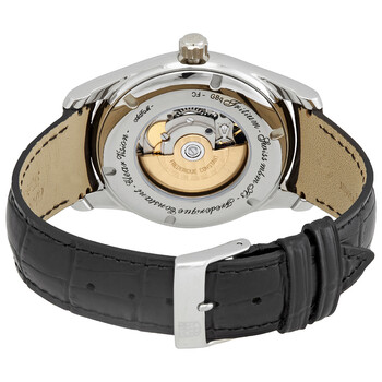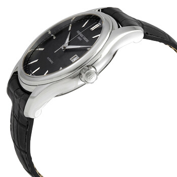 Silver-tone stainless steel case with a black leather strap. Fixed silver-tone stainless steel bezel. Black dial with luminous silver-tone dauphine-style hands and index hour markers. Minute markers around the outer rim. Dial Type: Analog. Luminescent hands and markers. Date display at the 3 o'clock position. Frederique Constant calibre FC-303 automatic movement, based upon Sellita SW200-1, containing 26 Jewels, bitting at 28800 vph, and has a power reserve of approximately 38 hours. Scratch resistant sapphire crystal. Transparent case back. Round case shape. Case size: 43 mm. Tang clasp. Water resistant at 100 meters / 330 feet. Functions: date, hour, minute, second. Casual watch style. Watch label: Swiss Made. Frederique Constant Automatic Black Dial Men's Leather Watch FC-303B6B6L.