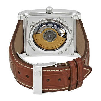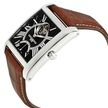 Stainless steel case with a brown leather strap. Fixed bezel. Black with a skeletal window dial with luminous silver-tone hands and Roman numeral hour markers. Minute markers around an inner ring. Dial Type: Analog. Luminescent hands. Frederique Constant Calibre FC-680 automatic movement with a 42-hour power reserve. Scratch resistant sapphire crystal. Pull / push crown. Transparent case back. Case size: 46 mm x 38.5 mm. Case thickness: 11 mm. Rectangle case shape. Fold over clasp. Water resistant at 30 meters / 100 feet. Functions: hour, minute, second. Luxury watch style. Watch label: Swiss Made. Frederique Constant Automatic Black Dial Men's Watch FC-680BS4C26.