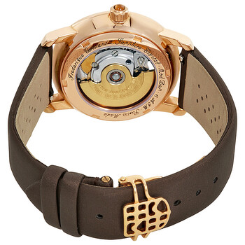 Rose gold-plated stainless steel case with a brown satin strap. Fixed rose gold-plated bezel set with diamonds. Brown (open heart) dial with rose gold-tone spade-shaped hands and diamond hour markers. Roman numeral marks the 6 o'clock position. Dial Type: Analog. Frederique Constant calibre FC-310 automatic movement, based upon ETA 2824-2, containing 26 Jewels, bitting at 28800 vph, and has a power reserve of approximately 38 hours. Scratch resistant mineral crystal. Pull / push crown. Skeleton case back. Round case shape. Case size: 34 mm. Case thickness: 19 mm. Band width: 19 mm. Fold over clasp with a safety release. Water resistant at 50 meters / 165 feet. Functions: hour, minute, second. Casual watch style. Watch label: Swiss Made. Item Variations: FC 310CLHB2PD4, FC.310CLHB2PD4, FC310CLHB2PD4. Frederique Constant Automatic Brown Dial Leather Ladies Watch FC-310CLHB2PD4.