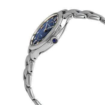 Stainless steel case with a stainless steel bracelet. Fixed stainless steel bezel. Navy blue mother of pearl dial with silver-tone sword-shaped hands and diamond hour markers. Roman numerals mark the 3, 9 and 12 o'clock positions. Dial Type: Analog. Date display at the 6 o'clock position. Frederique Constant calibre FC-306 automatic movement, based upon Sellita SW300-1, containing 25 Jewels, bitting at 28800 vph, and has a power reserve of approximately 42 hours. Scratch resistant convex sapphire crystal. Pull / push crown. Transparent case back. Round case shape. Case size: 33 mm. Case thickness: 8 mm. Band width: 15 mm. Fold over clasp with a push button release. Water resistant at 30 meters / 100 feet. Functions: date, hour, minute. Dress watch style. Watch label: Swiss Made. Frederique Constant Automatic Diamond Ladies Watch FC-306NHD3ER6B.