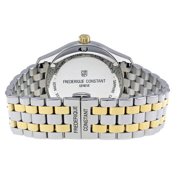 Silver-tone stainless steel case with a two-tone (silver-tone and gold-tone) stainless steel bracelet. Fixed gold-tone stainless steel bezel. White dial with gold-tone leaf-style shape hands and index and Roman numeral hour markers. Minute markers around the outer rim. Dial Type: Analog. Date display at the 3 o'clock position. Frederique Constant Calibre FC-303 Automatic movement, based upon Sellita SW200-1, containing 26 Jewels, bitting at 28800 vph, and has a power reserve of approximately 38 hours. Scratch resistant sapphire crystal. Pull / push crown. Solid case back. Round case shape, case size: 40 mm, case thickness: 10 mm. Band width: 20 mm, band length: 8 inches. Deployment clasp. Water resistant at 50 meters / 165 feet. Functions: date, hour, minute, second. Additional Info: in general, suitable for short periods of recreational swimming, but not diving or snorkeling. Luxury watch style. Watch label: Swiss Made. Item Variations: FC 303WN5B3B, FC.303WN5B3B, FC303WN5B3B. Frederique Constant Automatic White Dial Two-tone Men's Watch FC-303WN5B3B.