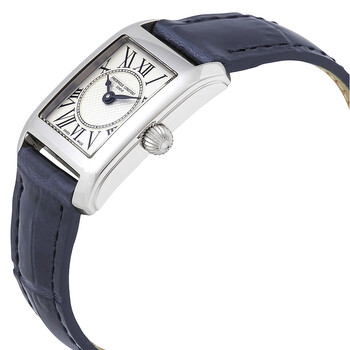 Stainless steel case with a blue leather strap. Fixed stainless steel bezel. Silver dial with black spade-shaped hands and Roman numeral hour markers. Minute markers around an inner ring. Dial Type: Analog. Frederique Constant calibre FC-200 quartz movement. Scratch resistant sapphire crystal. Pull / push crown. Solid case back. Rectangle case shape. Case dimensions: 23 mm x 21 mm. Case thickness: 5 mm. Band width: 20 mm. Tang clasp. Water resistant at 30 meters / 100 feet. Functions: hour, minute. Additional Info: withstands rain and splashes of water but not showering or submersion. Luxury watch style. Watch label: Swiss Made. Frederique Constant Carree Ladies Watch 200MC16.