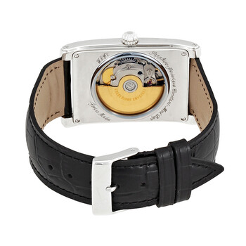 Stainless steel case with a black crocodile leather strap. Fixed bezel. Silver dial with black hands and Roman numeral hour markers. Dial Type: Analog. Date display at the 6 o'clock position. Automatic movement. Scratch resistant sapphire crystal. Pull / push crown. Skeleton transparent exhibition see through case back. Case size: 46.7 mm x 30.7 mm. Case thickness: 10.65 mm. Rectangle case shape. Tang clasp. Water resistant at 30 meters / 100 feet. Functions: date, hour, minute, second. Dress watch style. Watch label: Swiss Made. Item Variations: FC 303MC4C26, FC.303MC4C26, FC303MC4C26. Frederique Constant Carree Silver Dial Automatic Men's Watch FC-303MC4C26.