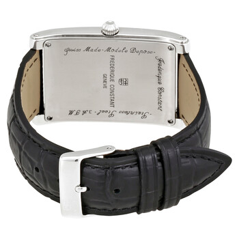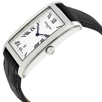 Stainless steel case with a black leather strap. Fixed stainless steel bezel. Silver dial with black hands and Roman numeral hour markers. Minute markers around the outer rim. Dial Type: Analog. Date display at the 6 o'clock position. Quartz movement. Scratch resistant sapphire crystal. Pull / push crown. Solid case back. Case size: 31 mm. Rectangle case shape. Band width: 20 mm. Water resistant at 30 meters / 100 feet. Functions: date, hour, minute. Dress watch style. Watch label: Swiss Made. Frederique Constant Carree Silver Dial Men's Watch FC-220MC4C26.