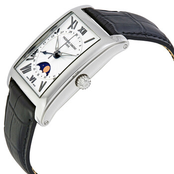 Stainless steel case with a black leather strap. Fixed stainless steel bezel. Silver guilloche dial with Roman numeral hour markers. Pointer date scale around an inner ring. Dial Type: Analog. Luminescent hands and markers. Pointer date. Moonphase. Caliber FC-330 automatic movement with about 38 Hour of power reserve. Scratch resistant sapphire crystal. 2 o-rings crown. Transparent case back. Case size: 34 mm x 45 mm. Case thickness: 10.9 mm. Rectangle case shape. Band width: 24 mm. Deployment with push button release clasp. Water resistant at 30 meters / 100 feet. Functions: date, hour, minute, second, moonphase. Casual watch style. Watch label: Swiss Made. Item Variations: FC 330MS4MC6, FC.330MS4MC6, FC330MS4MC6. Frederique Constant Carree Silver Dial Men's Watch FC-330MS4MC6.