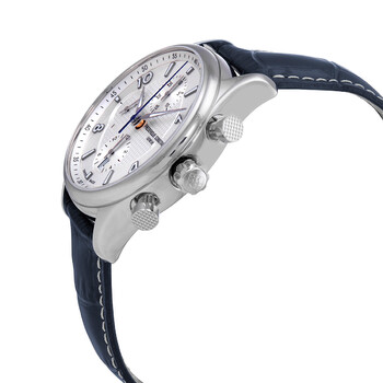 Stainless steel case with a blue (calfskin) leather strap. Fixed stainless steel bezel. Silver dial with luminous silver-tone hands and alternating index and Arabic numeral hour markers. Arabic numeral minute markers (at 5 minute intervals). Minute markers around the outer rim. Dial Type: Analog. Luminescent hands and markers. Date display at the 6 o'clock position. Chronograph - three sub-dials displaying: 60 second. 30 minute, and 12 hour. Frederique Constant calibre FC-392 automatic movement, based upon ETA 7750, containing 25 Jewels, bitting at 28800 vph, and has a power reserve of approximately 42 hours. Scratch resistant sapphire crystal. Screw down crown. Transparent case back. Round case shape. Case size: 42 mm. Case thickness: 14.5 mm. Band width: 20 mm. Fold over clasp with a safety release. Water resistant at 50 meters / 165 feet. Functions: chronograph, date, hour, minute, second. Casual watch style. Watch label: Swiss Made. Frederique Constant Chronograph Automatic Silver Dial Men's Watch FC-392RMS5B6.
