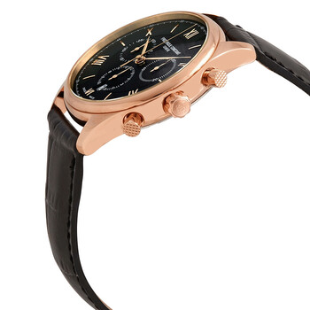 Black leather strap. Fixed bezel. Black dial with rose gold-tone hands and index-Roman numerals hour markers. Minute markers around the outer rim. Dial Type: Analog. Date display at the 6 o'clock position. Quartz movement. Scratch resistant sapphire crystal. Pull / push crown. Solid case back. Round case shape. Case size: 40 mm. Water resistant at 50 meters / 165 feet. Functions: chronograph, date, hour, minute, second. Dress watch style. Watch label: Swiss Made. Frederique Constant Chronograph Black Dial Men's Watch FC-292MB5B4.