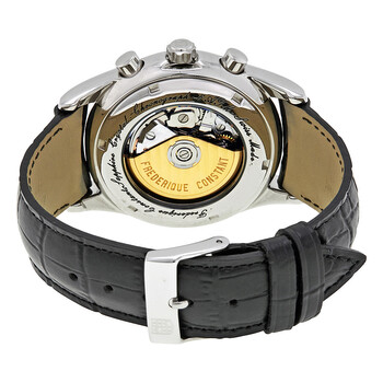 Stainless steel case with a black leather strap. Fixed stainless steel bezel. Black dial with luminous silver-tone hands and index hour markers. Minute markers around the outer rim. Dial Type: Analog. Luminescent hands and markers. Date display at the 6 o'clock position. Chronograph - three sub-dials displaying: 60 seconds. 30 minutes, and 12 hours. Swiss Automatic movement. Scratch resistant sapphire crystal. Pull / push crown. Transparent case back. Case size: 42 mm. Round case shape. Band width: 20 mm. Tang clasp. Water resistant at 50 meters / 165 feet. Functions: chronograph, date, hour, minute, second. Dress watch style. Watch label: Swiss Made. Frederique Constant Chronograph Black Dial Men's Watch FC-392B5B6.
