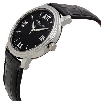 Stainless steel case with a black leather strap. Fixed stainless steel bezel. Black dial with silver-tone hands and index hour markers. Roman numerals mark the 6, 9 and 12 o'clock positions. Minute markers around the outer rim. Dial Type: Analog. Date display at the 3 o'clock position. Quartz movement. Scratch resistant sapphire crystal. Solid case back. Case size: 38 mm. Round case shape. Tang clasp. Water resistant at 30 meters / 100 feet. Functions: date, hour, minute, second. Casual watch style. Watch label: Swiss Made. Frederique Constant Classic Black Dial Men's Watch FC-240HB3P6.