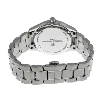 Stainless steel case with a stainless steel bracelet. Fixed stainless steel bezel. Black dial with silver-tone hands and index hour markers. Minute markers around the outer rim. Dial Type: Analog. Luminescent hands and markers. Date display at the 3 o'clock position. Automatic movement. Scratch resistant sapphire crystal. Solid case back. Case diameter: 40 mm. Case thickness: 10.20 mm. Round case shape. Deployment clasp. Water resistant at 50 meters / 165 feet. Functions: date, hour, minute, second. Dress watch style. Frederique Constant Classic Black Dial Stainless Steel Men's Watch FC-303B5B6B.