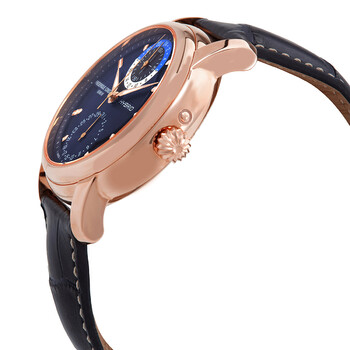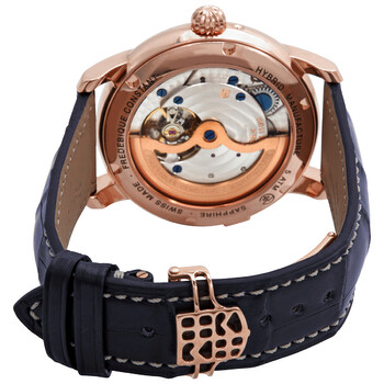 Rose gold PVD stainless steel case with a navy alligator leather strap. Fixed rose gold PVD stainless steel bezel. Blue dial with rose gold-tone alpha-style hands and index hour markers. Minute markers around the outer rim. Dial Type: Analog. Luminescent hands and markers. Two sub-dials displaying: date and 24 hour / 1/100th second. Frederique Constant Calibre FC-750 Automatic movement, containing 33 Jewels, bitting at 28800 vph, and has a power reserve of approximately 42 hours. Scratch resistant sapphire crystal. Onion pull / push crown. Transparent case back. Round case shape, case size: 42 mm. Band width: 22 mm. Tang clasp. Water resistant at 50 meters / 165 feet. Functions: date, hour, minute, second, 24 hour, GMT, sleep monitoring, vibration / sound notifications / activity tracking. Classic Hybrid Series. Luxury watch style. Watch label: Swiss Made. Frederique Constant Classic Hybrid Automatic Blue Dial Men's Watch FC-750N4H4.