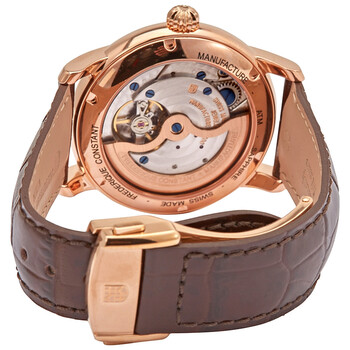 Rose gold PVD stainless steel case with a brown (calfskin) leather strap. Fixed rose gold PVD bezel. Silver dial with black leaf-style shape hands and Roman numeral hour markers. Minute markers around the outer rim. Dial Type: Analog. Two multi-function sub-dials displaying: date and moonphase. Frederique Constant calibre FC-712 automatic movement, containing 28 Jewels, bitting at 28800 vph, and has a power reserve of approximately 38 hours. Scratch resistant sapphire crystal. Pull / push crown. Transparent case back. Round case shape. Case size: 42 mm. Case thickness: 11 mm. Fold over clasp. Water resistant at 50 meters / 165 feet. Functions: date, hour, minute, second, moonphase. Classic Series. Luxury watch style. Watch label: Swiss Made. Frederique Constant Classic Moonphase Automatic Silver Dial Men's Watch FC-712MS4H4.