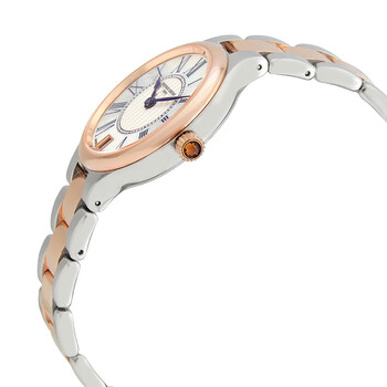 Silver-tone stainless steel case with a two-tone (silver-tone and rose gold PVD) stainless steel bracelet. Fixed rose gold PVD bezel. Silver-toned dial with blue hands and Roman numeral hour markers. Minute markers around an inner ring. Dial Type: Analog. Date display at the 6 o'clock position. Automatic movement. Scratch resistant sapphire crystal. Pull / push crown. Transparent case back. Round case shape. Case size: 36 mm. Band width: 15 mm. Hidden closure clasp. Water resistant at 30 meters / 100 feet. Functions: date, hour, minute. Dress watch style. Watch label: Swiss Made. Frederique Constant Classic Silver Dial Two-toned Ladies Watch FC-306MPWN3ER2B.