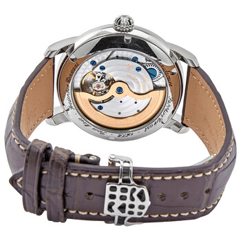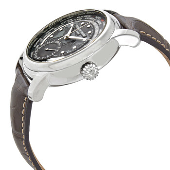 Stainless steel case with a brown (alligator) leather strap. Fixed stainless steel bezel. Grey dial with luminous silver-tone alpha-style hands and dot hour markers. Minute markers. 24 hour markers. World time cities around the outer rim. Dial Type: Analog. Luminescent hands and markers. Date sub-dial at the 6 o'clock position. Frederique Constant calibre FC-718 automatic movement, containing 26 Jewels, composed of 161 parts, bitting at 28800 vph, and has a power reserve of approximately 42 hours. Scratch resistant sapphire crystal. Pull / push crown. Transparent case back. Round case shape. Case size: 42 mm. Case thickness: 12 mm. Strap width: 22 mm. Folding clasp. Water resistant at 50 meters / 165 feet. Functions: world time, date, GMT, second time zone, hour, minute, second. Travel watch style. Watch label: Swiss Made. Frederique Constant Classic Wolrdtimer Automatic Grey Dial Men's Watch FC-718DGWM4H6.