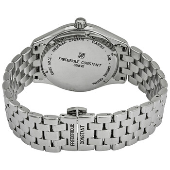 Stainless steel case with a stainless steel bracelet. Fixed stainless steel bezel. Blue dial with silver-tone leaf-style hands and alternating index and Roman numeral hour markers. Minute markers around the outer rim. Dial Type: Analog. Date display at the 3 o'clock position. Frederique Constant calibre FC-303 automatic movement, based upon Sellita SW200-1, containing 26 Jewels, bitting at 28800 vph, and has a power reserve of approximately 38 hours. Scratch resistant sapphire crystal. Pull / push crown. Solid case back. Round case shape. Case size: 40 mm. Case thickness: 10 mm. Band width: 20 mm. Fold over clasp with a push button release. Water resistant at 30 meters / 100 feet. Functions: date, hour, minute, second. Classics Series. Casual watch style. Watch label: Swiss Made. Frederique Constant Classics Automatic Blue Dial Men's Watch FC-303MN5B6B.