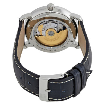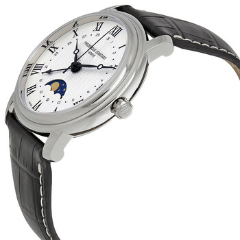 Stainless steel case with a blue leather strap. Fixed stainless steel bezel. Silver dial with black hands and Roman numeral hour markers. Date scale around an inner ring. Dial Type: Analog. Date display around inner dial. Moonphase sub-dial. Frederique Constant calibre FC-330 automatic movement with a 38-hour power reserve. Scratch resistant sapphire crystal. Push / pull crown. Transparent case back. Case size: 40 mm. Case thickness: 10 mm. Round case shape. Tang clasp. Water resistant at 100 meters / 330 feet. Functions: date, hour, minute, second, moonphase. Luxury watch style. Watch label: Swiss Made. Frederique Constant Classics Automatic Men's Watch 330MC4P6.