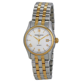 Stainless steel case with a two-tone (silver-tone and yellow gold-plated) stainless steel bracelet. Fixed yellow gold-plated bezel. Mother of pearl dial with yellow gold-tone hands and alternating Roman numeral and index hour markers. Minute markers around the outer rim. Dial Type: Analog. Date display at the 3 o'clock position. Frederique Constant calibre FC-303 automatic movement with a 38-hour power reserve. Scratch resistant sapphire crystal. Pull / push crown. Solid case back. Round case shape. Case size: 27.5 mm. Case thickness: 8.9 mm. Band width: 15 mm. Band length: 7 inches. Deployment clasp. Water resistant at 50 meters / 165 feet. Functions: date, hour, minute, second. Luxury watch style. Watch label: Swiss Made. Item Variations: FC 303MPWN1B3B, FC.303MPWN1B3B, FC303MPWN1B3B. Frederique Constant Classics Automatic Mother of Pearl Dial Ladies Watch FC-303MPWN1B3B.