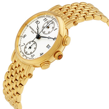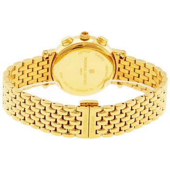 Gold-tone stainless steel case and bracelet. Fixed gold-tone bezel. Silver enamel dial with black hands and Arabic numeral hour markers. Minute markers. Tachymeter around the outer rim. Dial Type: Analog. Date display at the 3 o'clock position. Chronograph - two sub-dials displaying: 60 second and 30 minute. Frederique Constant calibre FC-291 quartz movement. Scratch resistant sapphire crystal. Solid case back. Case size: 34 mm. Case thickness: 10 mm. Round case shape. Deployment clasp with a push button release. Water resistant at 30 meters / 100 feet. Functions: chronograph, date, hour, minute, second. Casual watch style. Watch label: Swiss Made. Frederique Constant Classics Chronograph Silver Enamel Dial Gold-tone Ladies Watch 291A2R5B.