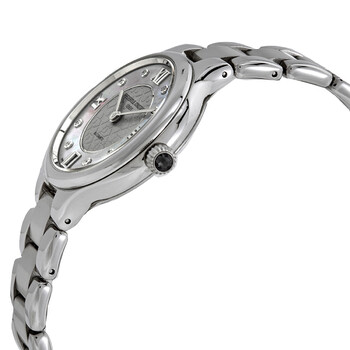 Stainless steel case with a stainless steel bracelet. Fixed stainless steel bezel. Light grey (mother of pearl) dial with silver-tone hands and diamond hour markers. Roman numerals mark the 3, 9 and 12 o'clock positions. Dial Type: Analog. Date display at the 6 o'clock position. Frederique Constant calibre FC-306 automatic movement with a 42-hour power reserve. Scratch resistant convex sapphire crystal. Pull / push crown. Transparent case back. Round case shape. Case size: 33 mm. Case thickness: 8 mm.Band width: 15 mm. Fold over clasp with a push button release. Water resistant at 30 meters / 100 feet. Functions: date, hour, minute. Dress watch style. Watch label: Swiss Made. Frederique Constant Classics Delight Automatic Diamond Ladies Watch FC-306LGHD3ER6B.
