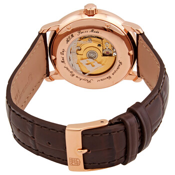Rose gold-tone stainless steel case with a brown (calfskin) leather strap. Fixed rose gold-tone bezel. Champagne (open heart) dial with blue hands and Roman numeral hour markers. Minute markers around the outer rim. Dial Type: Analog. Date display at the 6 o'clock position. Caliber FC-315 automatic movement. Scratch resistant sapphire crystal. Pull / push crown. Transparent case back. Round case shape. Case size: 40 mm. Case thickness: 10 mm. Band width: 22 mm. Tang clasp. Water resistant at 50 meters / 165 feet. Functions: date, hour, minute, second. Classics Heart Beat Series. Luxury watch style. Watch label: Swiss Made. Frederique Constant Classics Heart Beat Champagne Dial Men's Watch FC-315BG4P4.