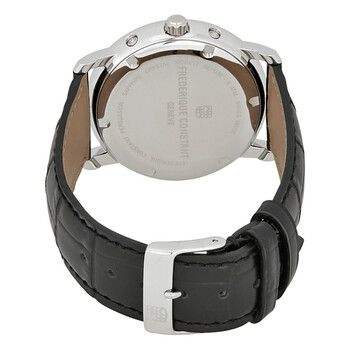 Silver-tone stainless steel case with a black leather strap. Fixed silver-tone stainless steel bezel. Black dial with black leaf-style shape hands and Roman numeral hour markers. 52 week markers around the outer rim. Dial Type: Analog. Date display at the 3 o'clock position. Three sub-dials displaying: date, day of the week and moonphase. Frederique Constant Calibre FC-260 quartz movement. Scratch resistant sapphire crystal. Pull / push crown. Solid case back. Round case shape, case size: 40 mm, case thickness: 10 mm. Band width: 22 mm. Tang clasp. Water resistant at 50 meters / 165 feet. Functions: date, day, hour, minute, second, moonphase. Classics Series. Dress watch style. Watch label: Swiss Made. Frederique Constant Classics Moonphase Black Dial Men's Watch FC-270BR4P6.