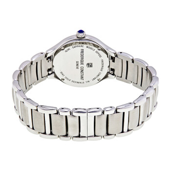Stainless steel case with a stainless steel bracelet. Fixed stainless steel diamond-set bezel. Mother of pearl dial with silver-tone hands and diamond hour markers. Roman numeral appears at the 12 o'clock position. Dial Type: Analog. Date display at the 6 o'clock position. Quartz movement. Scratch resistant sapphire crystal. Pull / push crown. Solid case back. Case size: 31 mm. Round case shape. Hidden clasp. Water resistant at 30 meters / 100 feet. Functions: date, hour, minute. Luxury watch style. Watch label: Swiss Made. Item Variations: FC 220WHD2ERD6B, FC.220WHD2ERD6B, FC220WHD2ERD6B. Frederique Constant Classics Mother f Pearl Diamond Dial Ladies Watch FC-220WHD2ERD6B.