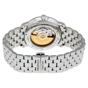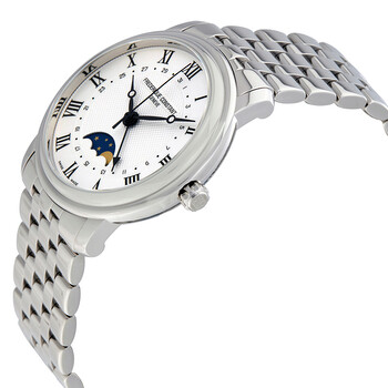 Silver-tone stainless steel case with a silver-tone stainless steel bracelet. Fixed silver-tone stainless steel bezel. Silver dial with black hands and Roman numeral hour markers. Dial Type: Analog. Pointer date. Frederique Constant Calibre FC-330 automatic movement with a 38-hour power reserve. Scratch resistant sapphire crystal. Transparent case back. Round case shape. Case size: 40 mm. Water resistant at 60 meters / 200 feet. Functions: moon phase, date, hour, minute, second. Dress watch style. Watch label: Swiss Made. Frederique Constant Classics Silver Dial Automatic Men's Watch FC-330MC4P6B.