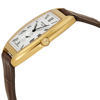 Gold-tone stainless steel case with a brown (calfskin) leather strap. Fixed gold-tone bezel. Silver dial with black hands and Roman numeral hour markers. Minute markers around the outer rim. Dial Type: Analog. Seconds sub-dial at the 6 o'clock position. Quartz movement. Scratch resistant sapphire crystal. Pull / push crown. Solid case back. Case dimensions: 30 mm x 34 mm. Case thickness: 6 mm. Tonneau case shape. Band width: 16 mm. Band length: 7 inches. Tang clasp. Water resistant at 30 meters / 100 feet. Functions: hour, minute, second. Dress watch style. Frederique Constant Classics Silver Dial Ladies Watch 235M3T25.