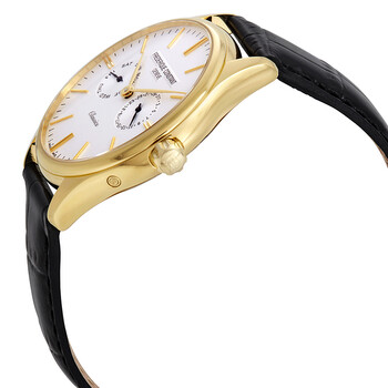 Gold-tone stainless steel case with a black leather strap. Fixed gold-tone two- date, day of the week bezel. White dial with gold-tone hands and index hour markers. Minute markers around the outer rim. Dial Type: Analog. Date display at the 3 o'clock, day of the week display at the 9 o' clock. Frederique Constant Calibre FC-259 quartz movement. Scratch resistant sapphire crystal. Pull / push crown. Solid case back. Round case shape, case size: 39 mm, case thickness: 9 mm. Band width: 20 mm. Buckle clasp. Water resistant at 50 meters / 165 feet. Functions: date, day, hour, minute, second. Casual watch style. Watch label: Swiss Made. Frederique Constant Classics White Dial Men's Watch FC-259BST5B5.