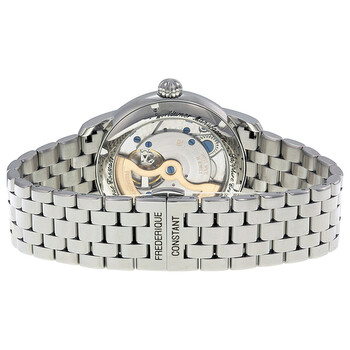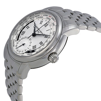 Silver-tone stainless steel case with a silver-tone stainless steel bracelet. Fixed silver-tone stainless steel bezel. Silver guilloche dial with black hands and Roman numeral hour markers. Rotating disc displaying 24 hour scale. worldtime cities around the outer rim. Dial Type: Analog. Date display at the 6 o'clock position. One subdial displaying: date. Frederique Constant Calibre FC-718 Automatic movement, containing 26 Jewels, composed of 161 parts, bitting at 28800 vph, and has a power reserve of approximately 42 hours. Scratch resistant sapphire crystal. Transparent case back. Round case shape, case size: 42 mm, case thickness: 12.1 mm. Band width: 20 mm. Fold over clasp. Water resistant at 50 meters / 165 feet. Functions: world time, GMT, second time zone, date, hour, minute, second. Worldtimer Series. Travel watch style. Watch label: Swiss Made. Item Variations: FC 718MC4H6B, FC.718MC4H6B, FC718MC4H6B. Frederique Constant Classics Worldtimer Silver Dial Stainless Steel Men's Watch FC-718MC4H6B.