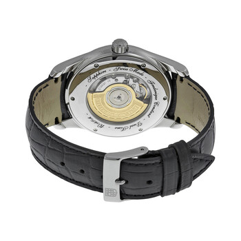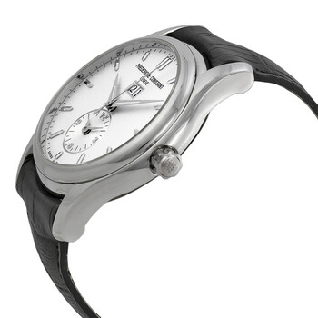 Stainless steel case with a black croco-embossed leather strap. Fixed bezel. Silver dial with luminous hands and index hour markers. Minute markers around the outer rim. Dial Type: Analog. Date display at the 12 o'clock position. 2nd time zone sub-dial. Automatic movement. Scratch resistant sapphire crystal. Pull / push crown. Case diameter: 43 mm. Round case shape. Tang clasp. Water resistant at 30 meters / 100 feet. Functions: GMT, second time zone, hour, minute, second. Luxury watch style. Watch label: Swiss Made. Frederique Constant Clear Vision Automatic White Dial Black Leather Men's Watch FC-325S6B6.