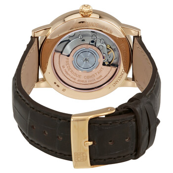18kt rose gold case with a brown alligator leather strap. Fixed rose gold-tone stainless steel bezel. Silver dial with black Breguet-style shape hands and Roman numeral hour markers. Minute markers around the outer rim. Dial Type: Analog. Date display at the 3 o'clock position. Frederique Constant Calibre FC-316 Automatic movement, containing 25 Jewels, bitting at 28800 vph, and has a power reserve of approximately 42 hours. Scratch resistant sapphire crystal. Transparent case back. Round case shape. Case size: 37.5 mm. Tang clasp. Water resistant at 50 meters / 165 feet. Functions: date, hour, minute. Dress watch style. Watch label: Swiss Made. Frederique Constant Constant Classic 18kt Rose Gold Automatic Men's Watch FC-316MC5B9.