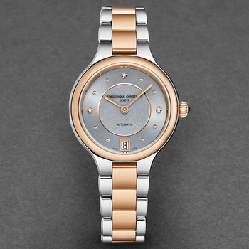 Silver-tone stainless steel case with a two-tone (silver-tone and rose gold-tone) stainless steel bracelet. Fixed rose gold-tone stainless steel bezel. Blue dial with rose gold-tone hands and diamond hour markers. Dial Type: Analog. Date display at the 6 o'clock position. Frederique Constant Calibre FC-306 Automatic movement, based upon Sellita SW300-1, containing 25 Jewels, bitting at 28800 vph, and has a power reserve of approximately 42 hours. Scratch resistant sapphire crystal. Pull / push crown. Transparent case back. Round case shape, case size: 33 mm, case thickness: 9 mm. Band width: 15 mm, band length: 7 inches. Fold over clasp with a safety release. Water resistant at 30 meters / 100 feet. Functions: date, hour, minute. Additional Info: hours, minutes, date. Delight Series. Luxury watch style. Watch label: Swiss Made. Frederique Constant Delight Automatic Diamond Blue Dial Ladies Watch FC-306LBD3ER2B.