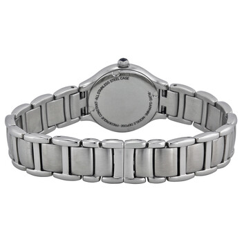 Stainless steel case with a stainless steel bracelet. Fixed stainless steel bezel. Mother of pearl (guilloche decoration) dial with black spade-shaped hands and Roman numeral hour markers. Minute markers around the outer rim. Dial Type: Analog. Frederique Constant calibre FC-200 quartz movement. Scratch resistant sapphire crystal. Pull / push crown. Solid case back. Round case shape. Case size: 26.5 mm. Case thickness: 7.4 mm. Band width: 14 mm. Fold over clasp. Water resistant at 30 meters / 100 feet. Functions: hour, minute. Casual watch style. Watch label: Swiss Made. Frederique Constant Delight Ladies Watch 200M1ER6B.