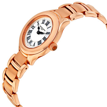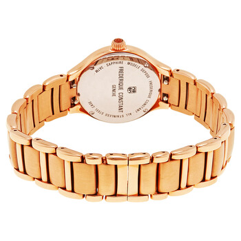 Rose gold PVD stainless steel case and bracelet. Fixed rose gold PVD stainless steel bezel. Silver and mother of pearl dial with black hands and Roman numeral hour markers. Minute markers around the outer rim. Dial Type: Analog. Date display at the 6 o'clock position. Frederique Constant calibre FC-220 quartz movement. Scratch resistant sapphire crystal. Pull / push crown. Solid case back. Case size: 31 mm. Round case shape. Hidden clasp. Water resistant at 30 meters / 100 feet. Functions: date, hour, minute. Luxury watch style. Watch label: Swiss Made. Item Variations: FC 220M2ER4B, FC.220M2ER4B, FC220M2ER4B. Frederique Constant Delight Mother of Pearl Dial Ladies Watch FC-220M2ER4B.