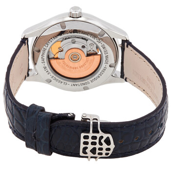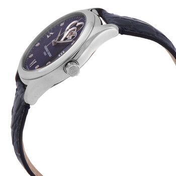 Stainless steel case with a navy blue (alligator) leather strap. Fixed stainless steel bezel. Blue (double open heart) dial with silver-tone hands and diamond hour markers. Roman numerals appear at the 3, 6 and 9 o'clock positions. Minute markers around the outer rim. Dial Type: Analog. Frederique Constant calibre FC-310 automatic movement, based upon ETA 2824-2, containing 26 Jewels, bitting at 28800 vph, and has a power reserve of approximately 38 hours. Scratch resistant sapphire crystal. Pull / push crown. Transparent case back. Round case shape. Case size: 36 mm. Case thickness: 10 mm. Band width: 18 mm. Deployment clasp with a push button release. Water resistant at 50 meters / 165 feet. Functions: hour, minute, second. Double Heart Beat Series. Dress watch style. Watch label: Swiss Made. Frederique Constant Double Heart Beat Automatic Diamond Blue Dial Ladies Watch FC-310NDHB3B6.