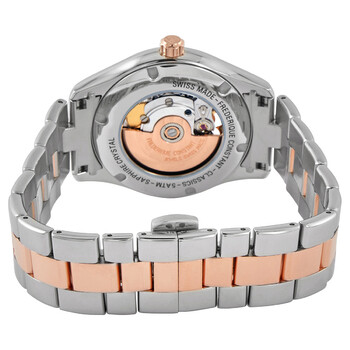 Stainless steel case with a two-tone (silver-tone and rose gold-tone) stainless steel bracelet. Fixed rose gold-tone bezel. Light grey sunray (double heart window) dial with rose gold-tone hands and diamond hour markers. Roman numerals mark the 3, 6 and 9 o'clock positions. Minute markers around the outer rim. Dial Type: Analog. Frederique Constant calibre FC-310 automatic movement, based upon ETA 2824-2, containing 26 Jewels, bitting at 28800 vph, and has a power reserve of approximately 38 hours. Scratch resistant convex sapphire crystal crystal. Pull / push crown. Transparent case back. Round case shape. Case size: 36 mm. Case thickness: 10.5 mm. Band width: 18 mm. Butterfly clasp with a push button release. Water resistant at 50 meters / 165 feet. Functions: hour, minute, second. Double Heart Beat Series. Dress watch style. Watch label: Swiss Made. Frederique Constant Double Heart Beat Automatic Diamond Ladies Watch FC-310LGDHB3B2B.