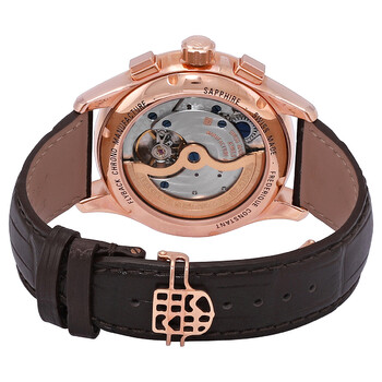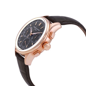 Rose gold-tone stainless steel case with a brown (alligator) leather strap. Fixed rose gold-tone bezel. Dark grey dial with luminous rose gold-tone hands and index hour markers. Minute markers. Tachymeter markings around the outer rim. Dial Type: Analog. Luminescent hands. Date display at the 6 o'clock position. Chronograph - two sub-dials displaying: 60 second and 30 minute. Date sub-dial. Frederique Constant calibre FC-760 automatic movement, containing 32 Jewels, bitting at 28800 vph, and has a power reserve of approximately 38 hours. Scratch resistant sapphire crystal. Transparent case back. Round case shape. Case size: 42 mm. Case thickness: 14 mm. Tang clasp. Water resistant at 50 meters / 165 feet. Functions: chronograph, flyback, date, hour, minute, second. Flyback Series. Casual watch style. Watch label: Swiss Made. Frederique Constant Flyback Chronograph Automatic Men's Watch FC-760DG4H4.