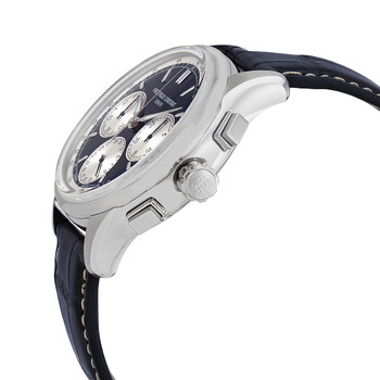 Silver-tone stainless steel case with a blue alligator leather strap. Fixed silver-tone stainless steel bezel. Navy dial with silver-tone hands and index hour markers. Tachymeter scale around the inner rim. Dial Type: Analog. Luminescent hands. Chronograph - sub-dials displaying: 60 seconds, 30 minutes. Frederique Constant Calibre FC-760 Automatic movement, containing 32 Jewels, bitting at 28800 vph, and has a power reserve of approximately 38 hours. Scratch resistant sapphire crystal. Transparent see through case back. Round case shape, case size: 42 mm. Folding clasp. Water resistant at 50 meters / 165 feet. Functions: chronograph, hour, minute, second. Flyback Series. Sport watch style. Watch label: Swiss Made. Frederique Constant Flyback Chronograph Automatic Men's Watch FC-760NS4H6.