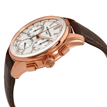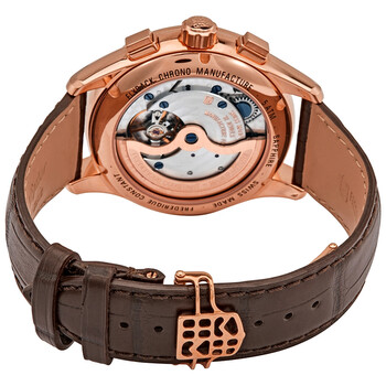Rose gold-plated stainless steel case with a brown (alligator) leather strap. Fixed rose gold-plated bezel. Silver dial with luminous rose gold-tone hands and index hour markers. Minute markers. Arabic numeral minute markers (at 5 minute intervals). Tachymeter markings around the outer rim. Dial Type: Analog. Luminescent hands and markers. Date display at the 6 o'clock position. Chronograph - two sub-dials displaying: 60 second and 30 minute Date sub-dial. Frederique Constant calibre FC-760 automatic movement, containing 32 Jewels, bitting at 28800 vph, and has a power reserve of approximately 38 hours. Scratch resistant sapphire crystal. Transparent case back. Round case shape. Case size: 42 mm. Case thickness: 13 mm. Band width: 20 mm. Deployment clasp. Water resistant at 50 meters / 165 feet. Functions: chronograph, flyback, date, hour, minute, second. Flyback Chronograph Manufacture Series. Sport watch style. Watch label: Swiss Made. Frederique Constant Flyback Chronograph Manufacture Automatic Men's Watch FC-760V4H4.