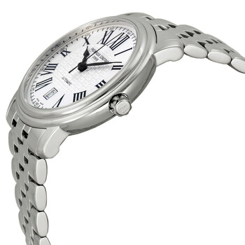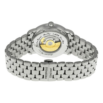 Stainless steel case with a stainless steel bracelet. Fixed stainless steel bezel. Silver dial with Roman numeral hour markers. Minute markers. 1/240 markers around the outer rim. Dial Type: Analog. Date display at the 6 o'clock position. Frederique Constant Calibre FC-303 automatic movement with about 38 hours of power reserve. Scratch resistant synthetic sapphire crystal. Pull / push crown. Transparent case back. Case size: 40 mm. Case thickness: 10 mm. Round case shape. Band width: 20 mm. Band length: 8.5 inches. Deployment clasp. Water resistant at 60 meters / 200 feet. Functions: date, hour, minute, second. Additional Info: suitable for showering; not usually suitable for swimming; unsuitable for diving). Dress watch style. Watch label: Swiss Made. Frederique Constant Geneve Classics Automatic Silver Dial Stainless Steel Men's Watch 303M4P6B2.
