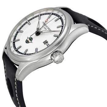 Stainless steel case with a black leather strap. Fixed stainless steel bezel. Silver dial with luminous grey hands and index hour markers. Minute markers. 24 hour (GMT) markers around the outer rim. Dial Type: Analog. Luminescent hands and markers. Date display at the 3 o'clock position. Automatic movement with a 38 hour power reserve. Scratch resistant sapphire crystal. Skeleton case back. Case diameter: 42 mm. Case thickness: 12.5 mm. Round case shape. Tang clasp. Water resistant at 50 meters / 165 feet. Functions: GMT. Luxury watch style. Watch label: Swiss Made. Frederique Constant Healey Automatic GMT Silver Dial Black Leather Men's Watch FC-350HS5B6.