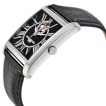 Stainless steel case with a black leather strap. Fixed stainless steel bezel. Black dial with a sleletal window with silver-tone hands and Roman numeral hour markers. Minute markers around an inner ring. Dial Type: Analog. Frederique Constant calibre FC-310 automatic movement. Scratch resistant sapphire crystal. Transparent case back. Case size: 46mm. Square case shape. Water resistant at 30 meters / 100 feet. Functions: hour, minute, second. Dress watch style. Watch label: Swiss Made. Frederique Constant Heart Beat Automatic Men's Watch FC-310BS5C26.