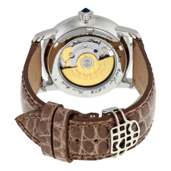 Stainless steel case with a brown (alligator) leather strap. Fixed stainless steel bezel set with diamonds. Mother of pearl (heart beat) dial with silver-tone spade-shaped hands and diamond hour markers. Arabic numerals mark the 3, 6 and 9 o'clock positions. Dial Type: Analog. Frederique Constant calibre FC-310 automatic movement, based upon ETA 2824-2, containing 26 Jewels, bitting at 28800 vph, and has a power reserve of approximately 38 hours. Scratch resistant sapphire crystal. Pull / push crown. Skeleton case back. Round case shape. Case size: 34 mm. Case thickness: 9.9 mm. Band width: 19 mm. Band length: 7 inches. Tang clasp. Water resistant at 60 meters / 200 feet. Functions: hour, minute, second. Dress watch style. Watch label: Swiss Made. Item Variations: FC 310HBAD2PD6, FC.310HBAD2PD6, FC310HBAD2PD6. Frederique Constant Heart Beat Automatic Mother of Pearl Diamond Dial Brown Leather Ladies Watch FC-310HBAD2PD4.