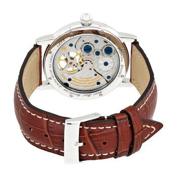 Stainless steel case with a brown alligator leather strap. Fixed bezel. Silver dial with silver-tone hands and Roman numeral hour markers. Dial Type: Analog. Frederique Constant Calibre FC-910 Automatic movement with about 42 hours of power reserve. Scratch resistant sapphire crystal. Pull / push crown. Skeleton transparent exhibition see through case back. Case size: 39 mm. Round case shape. Water resistant at 30 meters / 100 feet. Functions: hour, minute, second. Luxury watch style. Watch label: Swiss Made. Item Variations: FC 910MC3H6, FC.910MC3H6, FC910MC3H6. Frederique Constant Heart Beat Classics Silver Dial Men's Leather Watch FC-910MC3H6.