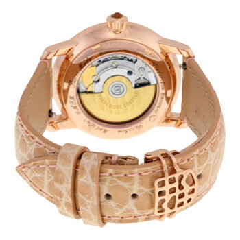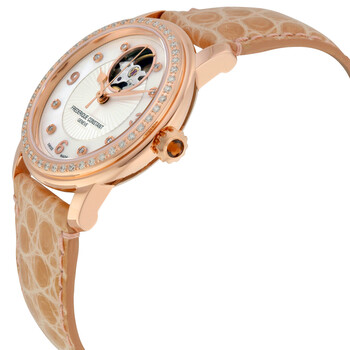 Rose gold-plated stainless steel case with a beige alligator leather strap. Fixed rose gold-plated set with diamonds bezel. Cut-out mother of pearl dial with rose gold-tone hands and diamond hour markers. Arabic numerals mark the 3, 6 and 9 o'clock positions. Dial Type: Analog. Automatic movement. Scratch resistant sapphire crystal. Pull / push crown. Skeleton case back. Case diameter: 34 mm. Case thickness: 9.9 mm. Round case shape. Band width: 19 mm. Band length: 7 inches. Tang clasp. Water resistant at 60 meters / 200 feet. Functions: hour, minute, second. Dress watch style. Watch label: Swiss Made. Item Variations: FC 310HBAD2PD4, FC.310HBAD2PD4, FC310HBAD2PD4. Frederique Constant Heart Beat Mother of Pearl Diamond Dial Beige Leather Ladies Watch FC-310HBAD2PD4.
